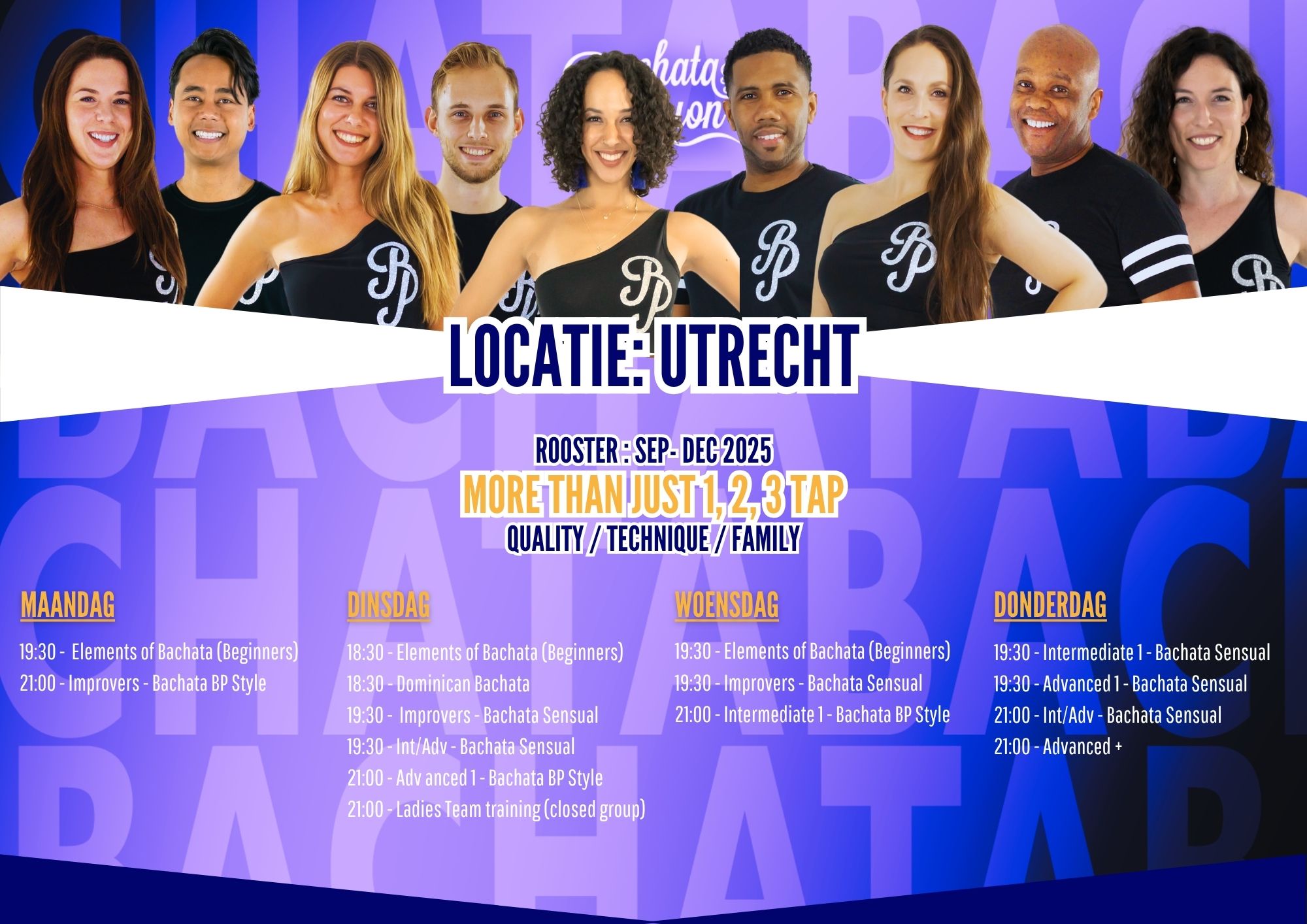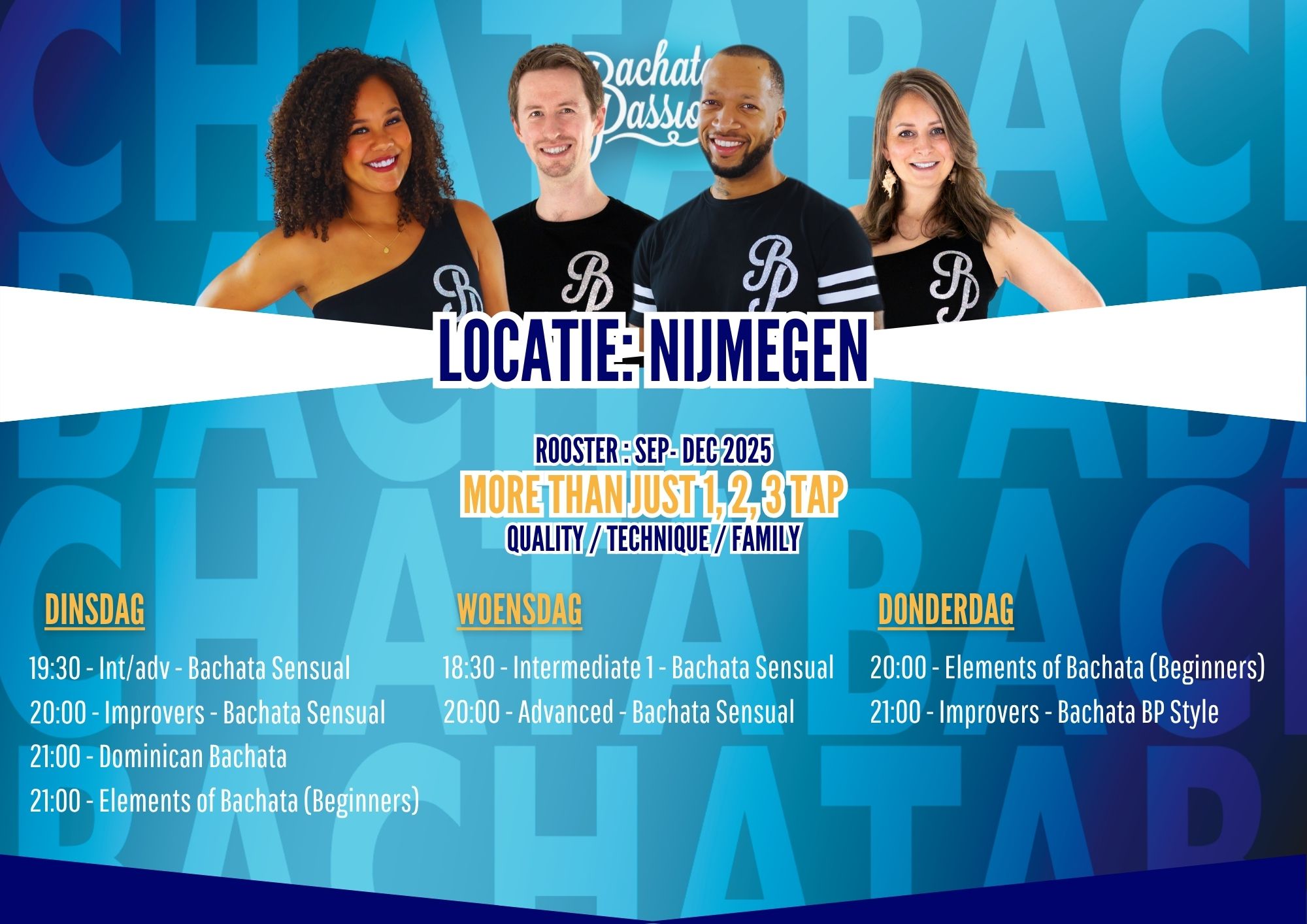Bij onze Academie volgen we een duidelijke structuur om je te leren dat Bachata veel meer is dan alleen 1, 2, 3, tap. Binnen Bachata zijn er momenteel drie hoofdstijlen: Bachata Moderna, Bachata Sensual en Traditioneel / Dominican. In plaats van ons te concentreren op maar één van deze stijlen, omarmen we alle verschillende Bachata stijlen.