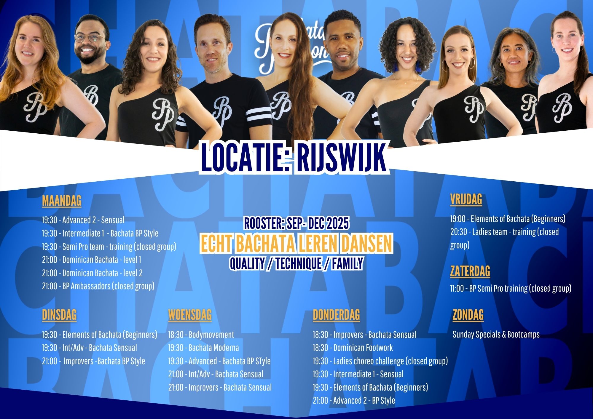 Wij geloven dat je vooral snel beter wordt in dansen door veel te oefenen, de techniek te begrijpen, de muziek te leren voelen, en een gezellige community om je heen te hebben met net zo gepassioneerde mensen, daarom hebben wij onze BP Academy opgericht voor iedereen die echt Bachata wil leren dansen. En kan je onbeperkt les volgen!